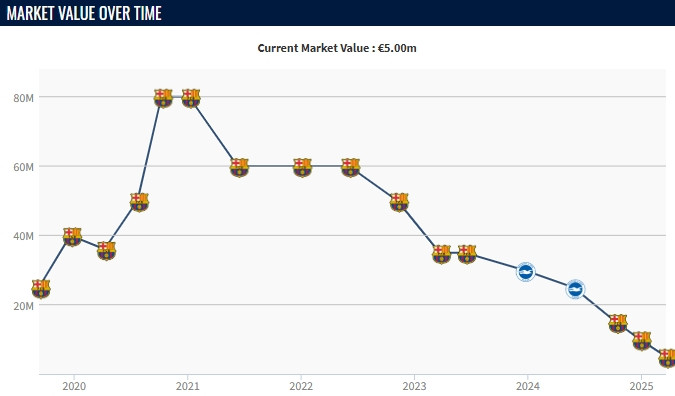 2020年时,17岁的法蒂身价就达到了8000万欧元,但半月板撕裂让法蒂伤缺超过10个月,也失去了在巴萨队中的位置。上赛季法蒂被租借到布莱顿,也没能找回昔日的状态。